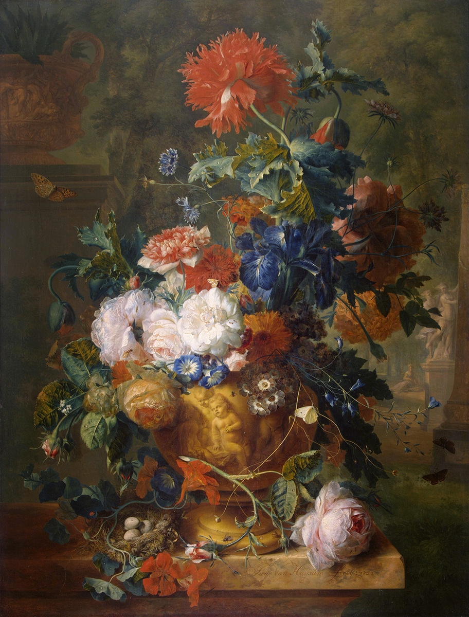 Этот великолепный букет, состоящий из множества роскошных сезонных цветов, стоит в вазе на каменном постаменте. Структура, форма и окраска цветов были переданы художником Яном ван Хёйсумом (1682–1749) с потрясающей виртуозностью. В отличие от художников старшего поколения, Ян ван Хейсум, как известно, писал цветы с натуры. Роза в правом нижнем углу (Rosa huysumiana) была им особенно любима. Кроме того, растительный мир имел и символический подтекст: бабочки (олицетворение человеческой души), насекомые, сорванная, увядшая роза — известные символы vanitas, напоминающие зрителю о том, насколько быстротечна жизнь. Рисунки на керамической вазе также являются частью этой нравоучительной традиции. Вдалеке виден парковый пейзаж со скульптурной группой «Аполлон и Дафна» Джанлоренцо Бернини (Галерея Боргезе, Рим). Хейсум впервые использовал этот тип композиции — букет цветов, изображенный на светлом фоне — около 1720 года. Картина из Эрмитажа — одно из самых изысканных его произведений. Вместе