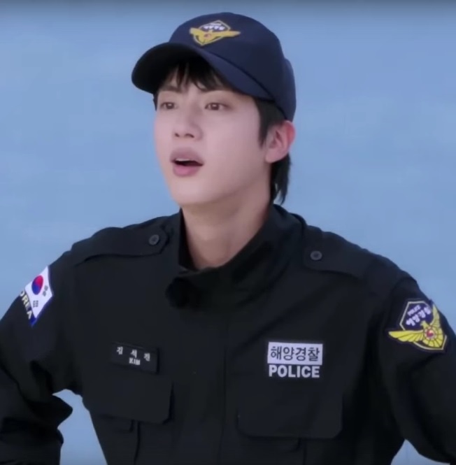 Вторая часть шоу проходила на пляже: К Джину и Сандылю присоединились служащие береговой охраны, образовав две команды - команду энергичных во главе с Джином и команду спокойных во главе с Сондылем: Джин, конечно, задавал парням-спасателям свой любимый вопрос: кто им нравится больше всего в BTS? Кто-то ответил - Джин, а кто-то назвал Ви, Джин сделал вид, что обиделся: "Ну вот, всегда так! Уходи отсюда!" Дальше начались командные конкурсы. Первый представлял из себя нечто вроде эстафеты, всех правил которой я, честно говоря, так и не поняла, но в одном из заданий нужно было опустить голову в воду и на таблице среди множества беспорядочно разбросанных букв хангыля опознать выражение, связанное со спасением на водах: Потом участников наполовину закопали в песок - они играли в "Прыгающего тунца". Я не могу найти правил и никак не пойму, в чем суть, но это что-то вроде корейской игры "Горячая сковородка": Фразу "Прыгающий тунец", которая повторялась мильён раз, я даже выучила: jeompeu cha