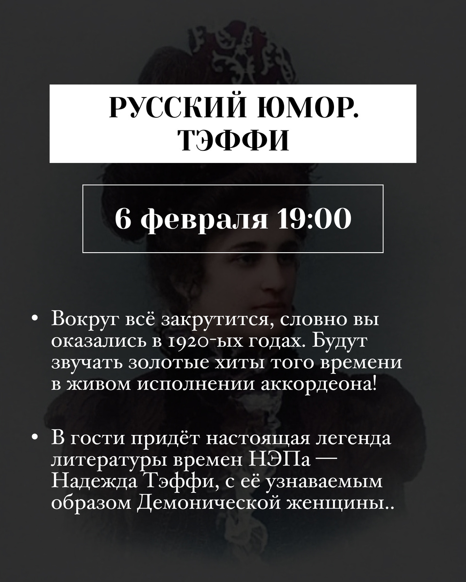 ГАСТРОНОМИЧЕСКИЙ ТЕАТР В КРОМЕШНОЙ ТЕМНОТЕ «РУССКИЙ ЮМОР. ТЭФФИ»✍🏻📃