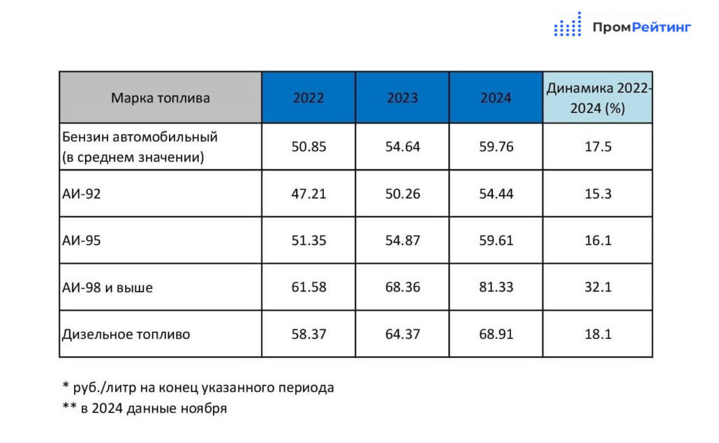 Как менялись цены на топливо в России с 2022 по 2024 годы