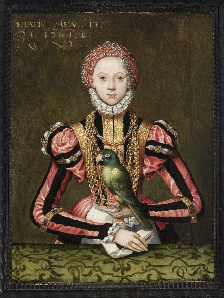 Локация: Коллекция Фрица Томе На этом портрете запечатлена юная Армгард фон Ритберг — наследница знатного рода, которой на момент создания картины было 15 лет. Внимательный взгляд, безмятежная осанка и богатство деталей её наряда говорят не только о социальном статусе, но и о художественном мастерстве Херманна том Ринга, одного из выдающихся мастеров Северного Возрождения. Её наряд — шедевр эпохи: бархатное платье с контрастными чёрно-розовыми рукавами, обильно украшенное золотыми цепями, кружевами и вышивкой. Головной убор, расшитый жемчугом, дополняет образ юной аристократки, подчёркивая её благородное происхождение. 🔸 Попугай в руках Армгард — это не просто экзотическая деталь. В эпоху Возрождения попугаи символизировали изысканность, утончённость, а также благородное воспитание. Они были популярными спутниками дам высокого положения, подчёркивая их статус и образованност