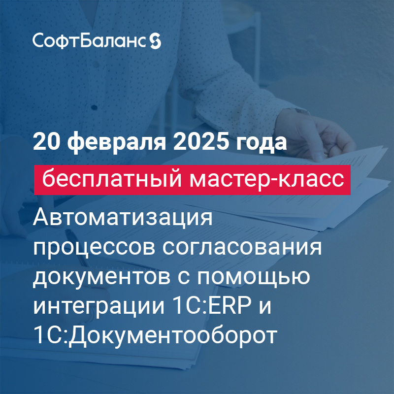 Приглашаем вас на бесплатный очный мастер-класс "Автоматизация процессов согласования документов с помощью интеграции 1С:ERP и 1С:Документооборот", который пройдет в г. Санкт-Петербурге 20 февраля. Специалисты торгово-производственных компаний сталкиваются с необходимостью согласовывать различные виды документов: договоры, заявки на оплату, заказы на производство и заказы поставщикам, заявки на внутреннее потребление, входящие счета, акты выполненных работ. Если при этом компания ведет учет в 1С:ERP или 1С:Комплексной автоматизации, то согласование документов происходит вне учетной системы, что приводит к следующим рискам: В рамках мастер-класса участники узнают, как можно избежать этих и других проблем благодаря интеграции учетной системы, используемой компанией, с 1С:Документооборотом. Участие в мастер-классе позволит вам: Ведущая мастер-класса: Виктория Конышева, руководитель отдела типового запуска систем 1С, 1С:Франчайзинг ГК "СофтБаланс". Опыт автоматизации документных процессов