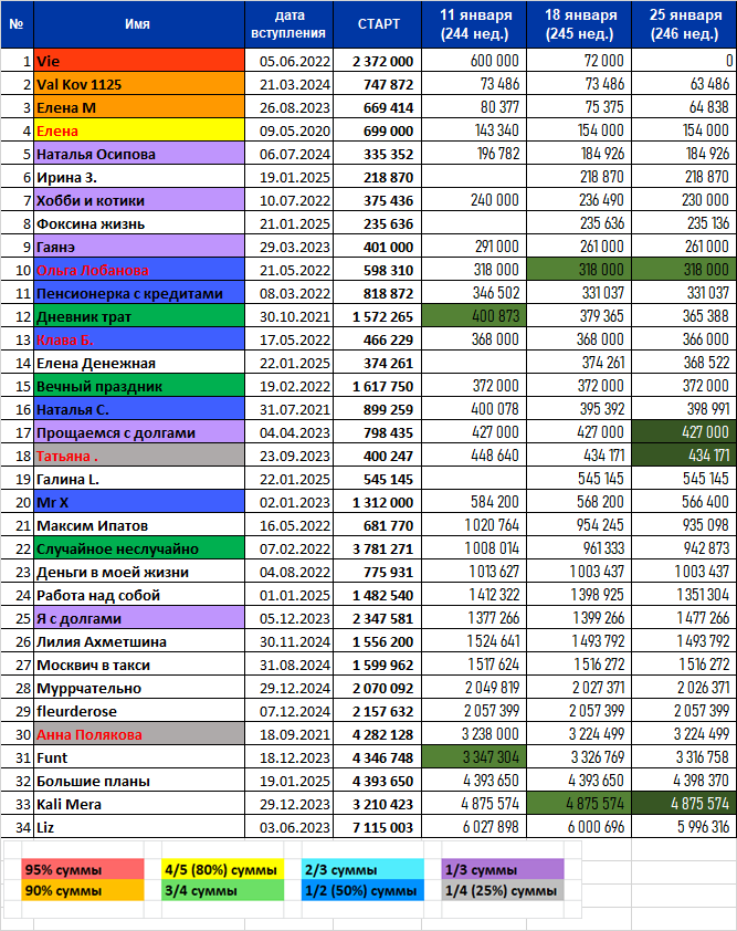 Всем привет! Сегодня суббота, а значит, пришло время отчитаться о своих долгах! Ну что, как прошла эта неделя? Удалось ли уменьшить долги или остались с той же суммой? Это ничего, главное - долги не увеличивать. Но и погашать, конечно, тоже нужно. Мы все имеем разные суммы, сроки и погашаем каждый в своем темпе. Для кого-то уменьшить на 10000 в месяц - это достижение, а кому-то погасить меньше 30000 означает просрочку. Поэтому мы не равняемся друг на друга, а сравниваем себя с собой же! Это главное. Вот таблица прошлой недели: Я в этот раз в тройку лидеров не попаду, но попаду в рубрику "копейка рубль бережёт". Так как мой долг уменьшился всего на 123 рубля! И это неудивительно, ведь основные платежи у меня распределены на 20 и 5 числа месяца - в дни получения зарплаты. А между этим я отправляю на кредит дополнительные доходы. И то не полностью, а только часть (у меня своя система). И получается, что по копеечке да по чуть-чуть долг становится всё меньше и меньше. Вот такие дела. Ну а