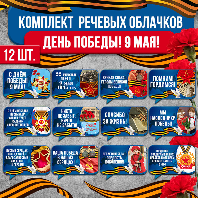 Речевые облачка ко Дню Победы 9 мая. Комплект состоит из 12 красивых речевых облаков.