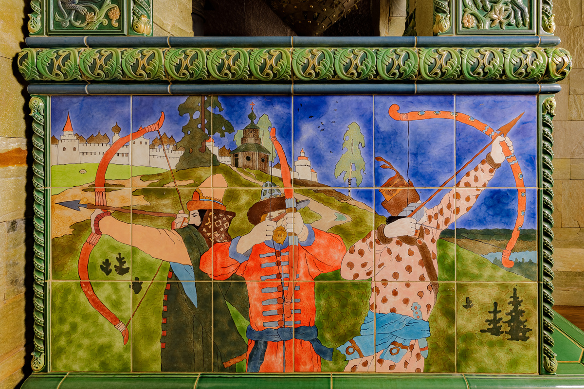 Творческая керамическая мастерская «АИ» организована в 1991 году художниками Владимиром Акулинским и Сергеем Иваниловым. Главное направление деятельности мастерской — проектирование и создание майоликовых изразцов для каминов и печей. На фото — изразцовая банная печь, композиция которой основана на рельефных изразцах — переработках книжной графики Ивана Яковлевича Билибина, а точнее, иллюстраций к русской народной сказке «Царевна-лягушка». Изразцы выполнены в традициях национально-романтического направления в русском искусстве. Доминирующие изразцы декорированы методом «многослойных напылов» цветными легкоплавкими глазурями. Панно изготовлено методом росписи огнеупорными пигментами и легкоплавкими полупрозрачными глазурями по сырой эмали. Печь оснащена кованым «гнездом» для ароматических трав, оно установлено за изразцовой аркой с изразцами «коромысло» и гирькой. Изразец «коромысло» декорирован рельефным растительным орнаментом с чертополохом. Карниз, венчающий печь, украшен рельефным