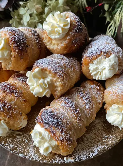 7. Выпекаем в предварительно разогретой до 200 градусов духовке, в течение 25 минут, пока не подрумянится. После легкого остывания трубки снимаем с форм. Остужаем, заливаем кремом, посыпаем сахарной пудрой.