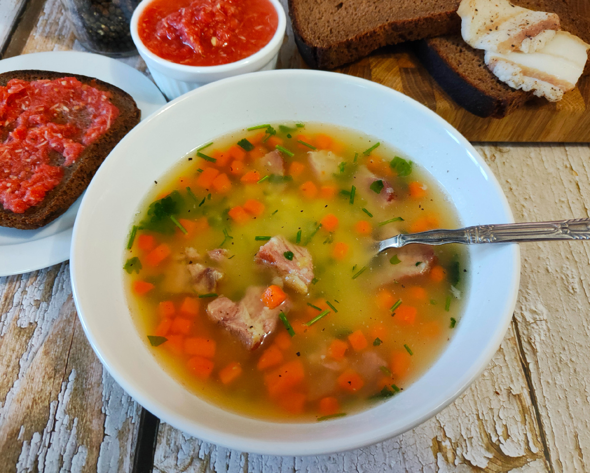 По моему мнению, это лучший рецепт горохового супа, при этом очень простой в приготовлении и, очевидно, не самый полезный: всё же копчёности не рекомендуется есть часто 😋 Но здесь всё как мы любим: суп насыщенный, в меру густой, с ярким ароматом копчения, горох разваренный до состояния пюре, а овощи придают аппетитный вид и приятную сладковатую нотку. И главное - никакой картошки! Она в гороховом супе абсолютно ни к чему, если только вы намеренно не хотите получить суп "по-столовски" (а что, есть и такие любители 😉) - копчёные рёбрышки мясистые примерно 500 гр. - горох 1 полный стакан - лук 1 шт. - морковь 1 шт. - лавровый лист 1-2 шт. - соль по вкусу (у меня 1,5 ч.ложки без горки, с учётом, что рёбра уже солёные) - перец чёрный горошком или молотый по вкусу - сода пищевая 1/2 ч.ложки - свежая зелень (укроп, петрушка) Прежде всего промываем горох и замачиваем его в холодной воде так, чтобы вода была на два пальца выше крупы. Добавляем в воду 1/2 ч.ложки пищевой соды. Благодаря этом