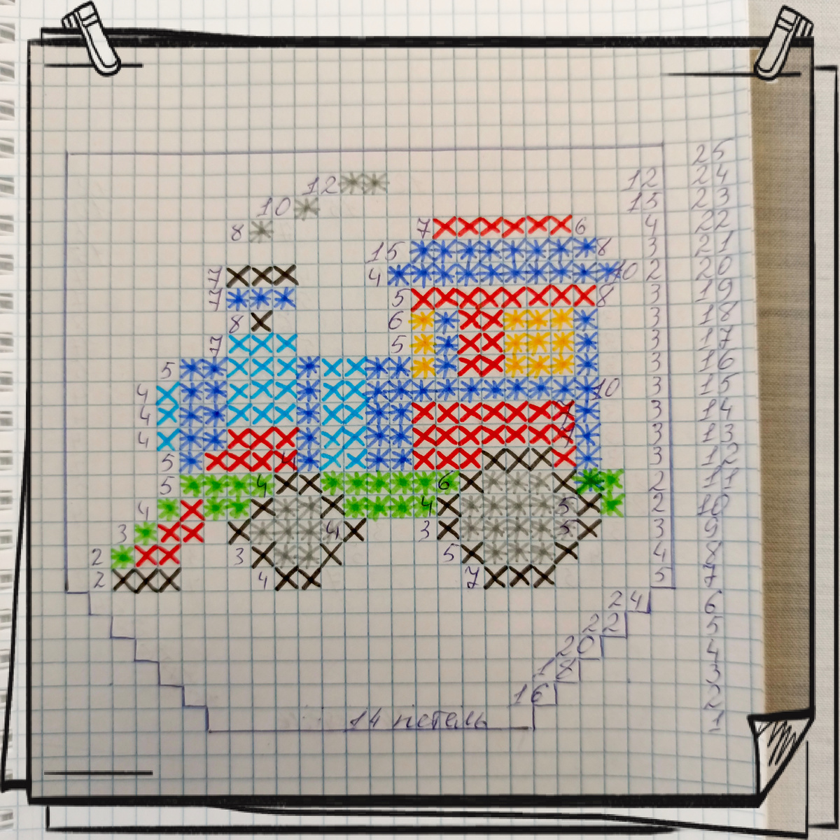1ряд-Набираем косичку из 14 петель. 2,3,4,5,6 ряды-вяжем основной нитью до 24 петель с прибавками. 7ряд-5 осн.3 чёрн.7 осн.2 чёрн.4 осн.3 чёрн.2 осн. с приб. 8ряд-4 осн.1 чёрн.3 сер.1 чёрн.5 осн.1 чёрн.2 сер.1 чёрн.3 осн.2 красн.1 зел. 2 осн. 9ряд-3 осн.1 чёрн.5 сер.1 чёрн.3 осн.1 чёрн.4 сер.1 чёрн.1 осн.2 красн.1 зел.3 осн. 10ряд-2 осн.1 зел.1 чёрн.5 сер.1 чёрн.4 зел.1 чёрн.2 сер.1 чёрн.2 зел.1 красн.1 зел.4 осн. 11ряд-2 осн.2 зел.1 чёрн.3 сер.1 чёрн.6 зел.2 чёрн.4 зел.5 осн. 12ряд-3 осн.1 син.1 красн.3 чёрн.3 красн.2 син.2 гол.1 син.4 красн.1 син.5 осн. 13ряд-3 осн.1 син.7 красн.2 син.2 гол.1 син.3 красн.2 син.1 гол.4 осн. 14ряд-3 осн.1 син.7 красн.2 син.2 гол.1 син.3 гол.2 син.1 гол.4 осн. 15ряд-3 осн.10 син.2 гол.1 син.3 гол.2 син.1 гол.4 осн. 16ряд-3 осн.1 син.3 жёлт.2 красн.1 син.1 жёлт.2 син.2 гол.1 син.3 гол.2 син.5 осн. 17ряд-3 осн.1 син.3 жёлт.2 красн.1 син.1 жёлт.5 осн.3 гол.7 осн. 18ряд-3 осн.1 син.3 жёлт.2 красн.1 син.1 жёлт.6 осн.1 чёрн.8 осн. 19ряд-3 осн.8 красн.5 осн.3