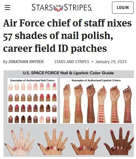 Как только тов. Дональд Трамп стал де-юре президентом Штатов, в вооруженных силах державы принялись спешно тюнинговать дисциплину + ужесточать дресс-код. Что касается лака для ногтей, то до сих пор их было разрешено в авиации 60 разных видов. Начальник штаба генерал Дэвид Олвин запретил 57 и оставил лишь три – прозрачный, «французский маникюр» и «американский маникюр».