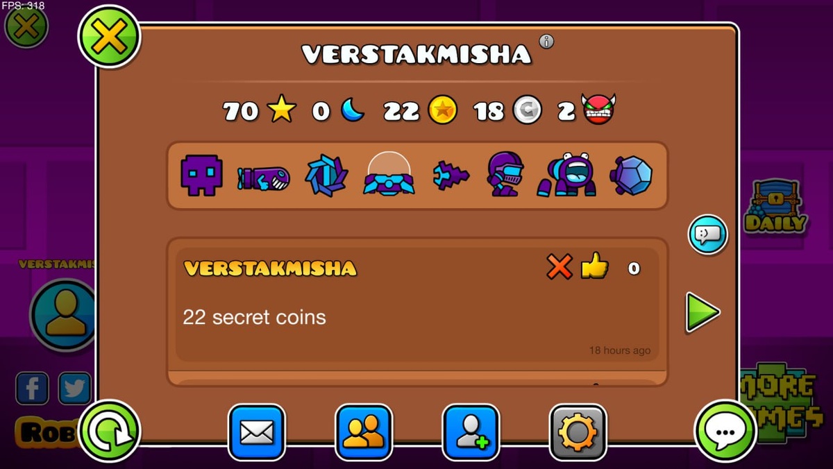 70 звёзд 0 лун 452 алмаза 22 золотой монеты 18 серебряных монет 2 демона Нет Jumper by robtop