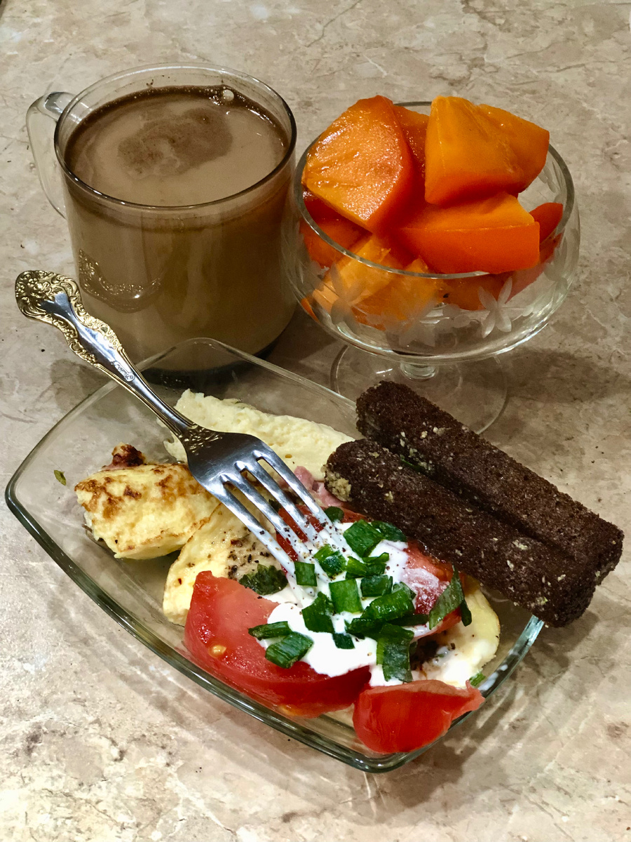 Сегодня 30 января 2025 года. Работаю с 8 до 17 часов. Встаю в 5, потом либо занимаюсь на беговой дорожке около часа, либо чищу снег во дворе, если был снегопад, чтобы выехать из гаража, либо делаю какие-то срочные дела (например, сегодня утром варила рыбу котикам, ибо разморозилась за ночь, и отделяла филе от костей). Затем иду в душ, завтракаю, привожу себя в порядок, сушу и укладываю волосы, делаю макияж, одеваюсь-наряжаюсь и примерно в 7 часов 10 минут выезжаю из дома на работу. Завтракаю я творогом уже давно, с начала лета или с весны, уже точно не помню. В творог обязательно добавляю отруби и какие-нибудь "присадки" - джем или мед, пергу, пыльцу, свежие ягоды или фрукты, все по настроению. На ужин в последнее время делаю омлет. На газе он поднимается хорошо, толстенький такой, пышный. Яйца и молоко - деревенские. Масло местное закончилось, поэтому - покупное, белорусское 82%. Сегодня "присадки" к омлету такие: одна сосиска баварская с сыром, щепотка своей замороженной петрушки, а