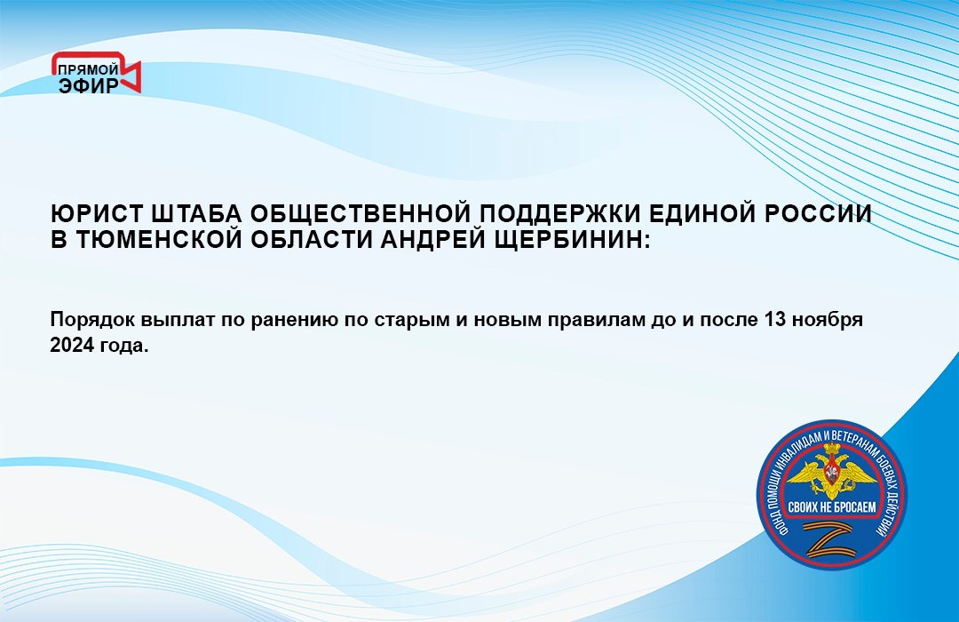 Прямой эфир юриста Штаба общественной поддержки Единой России в Тюменской области Андрея Щербинина на тему «Порядок выплат по ранению по старым и новым правилам до и после 13 ноября 2024 года». ✔️ 01:36 – Порядок выплат по ранениям, полученным до 13 ноября 2024 года. ✔️ 08:13 – Что делать, если не выдали или отказали в справке о ранении. ✔️ 12:59 – Выплаты по ранению, полученному после 13 ноября 2024 года. ✔️ 17:32 – Порядок выдачи справок. ✔️ 18:30 – Срок выплат по ранению. ✔️ 19:00 – Примеры.