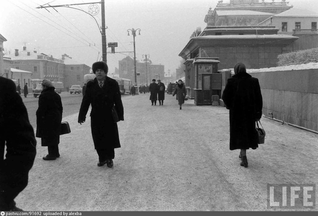 Давайте совершим очередное путешествие сквозь время по улицам родного города, посмотрим, какой была жизнь в пятидесятых и что изменилось за прошедшие десятилетия. Поехали! ... На фото Моховая улица уходящая к Боровицкой площади. Справа вестибюль станции метро "Библиотека имени Ленина", а далее Дом Пашкова. Обратите внимание на застройку по левой стороне улицы. Фото 1959 года, Карл Миданс Вид с этой точки сейчас. Вестибюль станции метро через несколько лет демонтировали, а вход в метро теперь чуть дальше от проезжей части. По левой стороне Моховой исчезли пару домов, их снесли в начале семидесятых годов, когда расширяли Боровицкую площадь. А ещё в кадре на горизонте появились купола Храма Христа Спасителя, воссозданного в девяностых годах А это фото сделано у входа на станцию метро "Курская", вид от площади у Курского вокзала. Обратите внимание на второй этаж здания. Фото 1956 года, Великжанин По одежде людей сразу понятно, что это наши дни, да и по кондиционерам, а ещё изменились окна