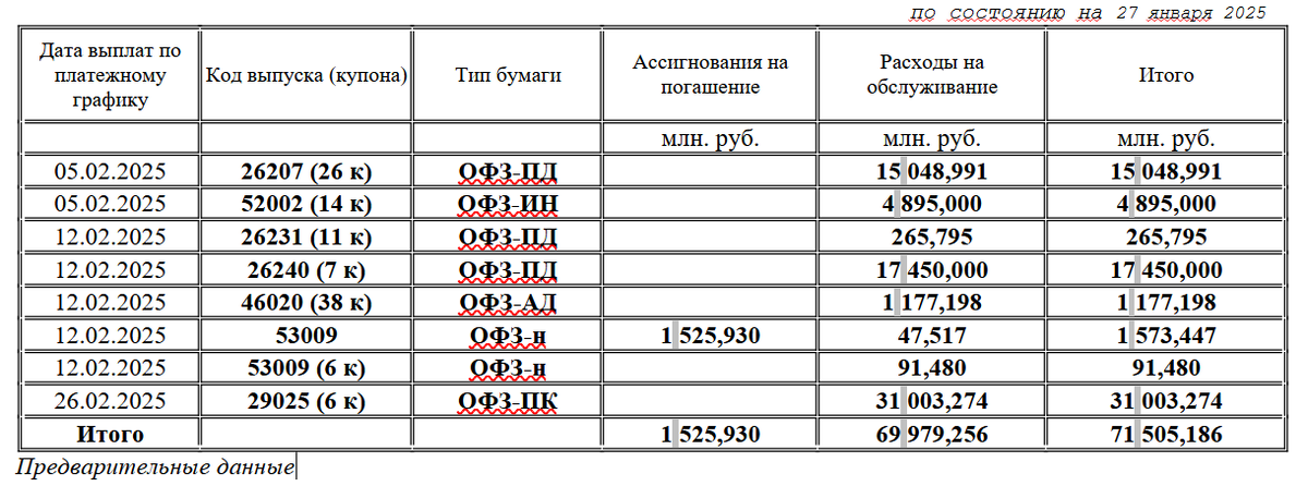 Минфин опубликовал данные о выплатах по ОФЗ в феврале 2025 года.