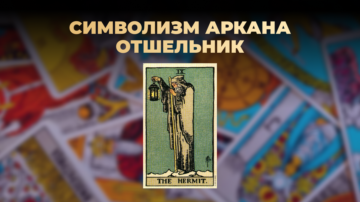 Аркан Отшельник – это карта поиска истины. В мифах и сказках – это этап встречи с мудрым старцем, который помогает герою ответить на вопрос «кто я есть, какое мое настоящее имя?». Старец – это образ, архетип. Внутренний Мудрец есть в каждом человеке, и чтобы с ним познакомиться, получить от него подсказки, нужно прислушаться к внутреннему голосу. Что символизирует капюшон Отшельника? Капюшон обозначает тишину и защиту головы от внешних воздействий (от шума). Человек надевает капюшон для того, чтобы уединиться и провести честный разговор с собой. Встретиться с Отшельником может каждый, кто уединится в тишине. Прохождение этапа Отшельник – это взросление и осознание себя. Многие люди боятся быть в тишине, потому что могут приходить какие-то ответы, к которым они иногда не готовы. Посох – символ пути. В данном случае это духовный путь, поиск мудрости. Также посох – ещё и опора. Он опирается на свои знания, опыт, убеждения, лежащие в основе его мировоззрения и служащие для него опорой. Фон