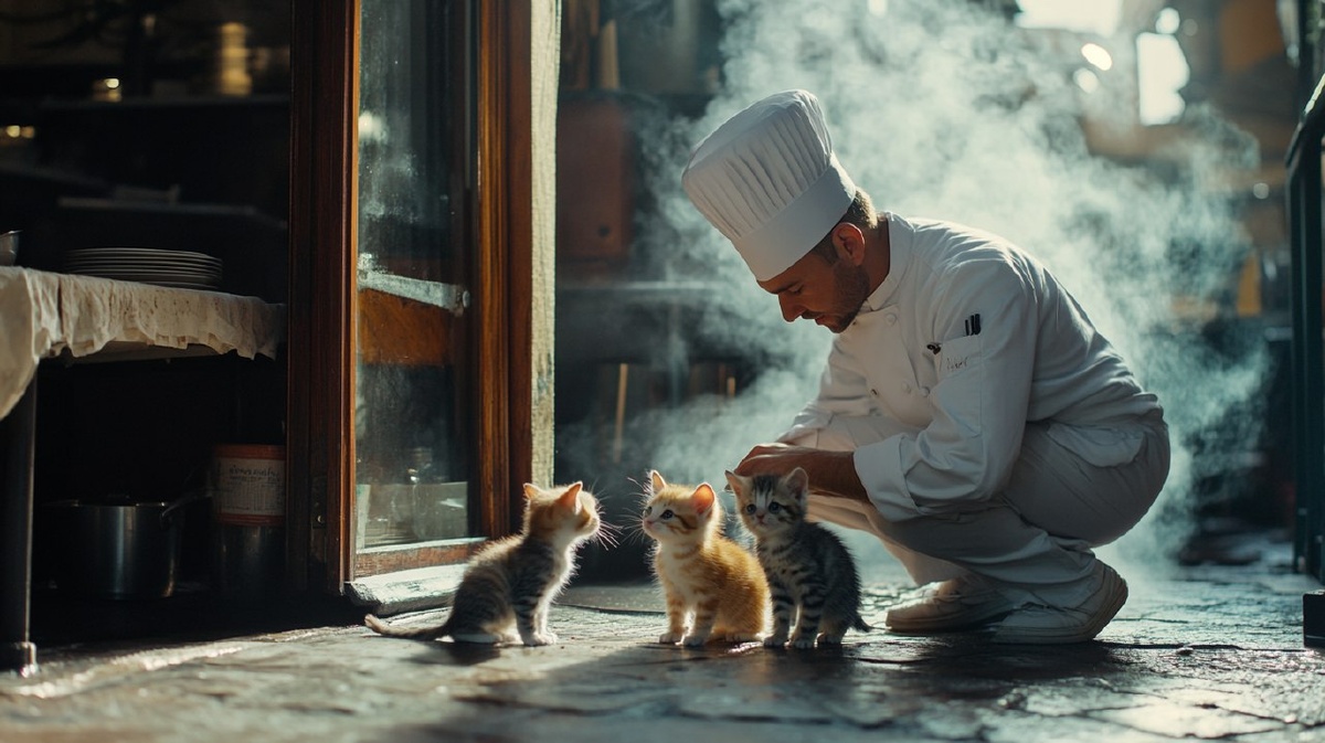 Однажды промозглым октябрьским утром он, как обычно, подошел к черному входу и услышал тихое мяуканье. У стены, прижавшись друг к другу, сидели три маленьких котенка – два рыжих и один серый в полоску. Они испуганно смотрели на него огромными глазами, но не убежали.
