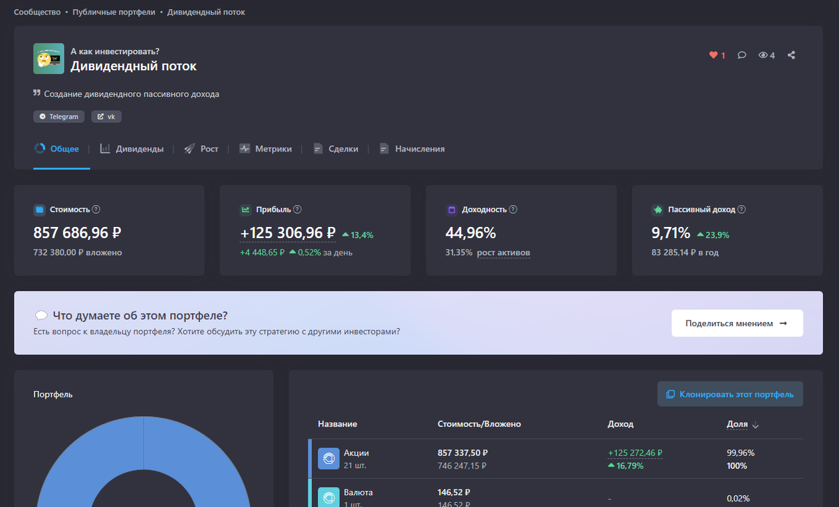 Привет, опубликовал свой портфель в сервисе по учету инвестиций Можно посмотреть какие акции в моем портфеле, какие дивиденды, сколько пополняю и т.д. вот 👉 публичный портфель Моя стратегия: Дивидендная Наращиваю дивидендный поток, не смотря на стоимость акций в моменте, для меня важно количество акций. Стоимость портфеля может колебаться от минуса и плюса, на дивиденды это не влияет, потому что компания платит процент от своей прибыли. По аналогии это как сдавать свою квартиру в аренду, тебе важны только месячные выплаты, а саму квартиру ты не собираешься продавать, и не мониторишь цену 10 раз на дню😄 Поэтому когда рынок падает или есть просадки, для дивидендного инвестора это время закупить просевшие акции. При этой стратегии, ты не переживаешь сколько стоит твой портфель, на сколько упали акции в моменте, это абсолютно НЕВАЖНО, компании как платили дивиденды так и платят, в кризис даже больше, т.к. акционерам нужны деньги. Наш рынок сейчас находится под большим давлением санкций,