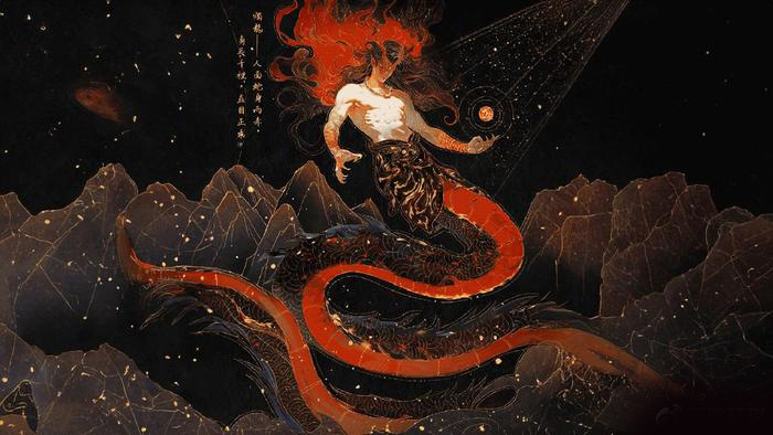 «… есть великий бог, могущественнее Паньгу и Призрачной Матери, его называют Светоносный Дракон, а также - «Фонарь Девяти Теней». У него лицо человека и тело змеи, красно-коричневого цвета. Тело простирается на тысячи миль. Глаза у него необычные, иногда похожи на выпрямленную оливку, иногда на прямую горизонтальную линию.