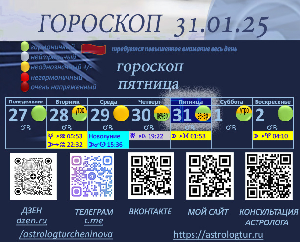 Основной аспект этого дня СОЛНЦЕ ТРИН ЮПИТЕР! Аспект Счастья, Удачи, Успеха! Влияние аспекта будет минимум до 02.02.25. Благоприятный аспект Солнца с Юпитером приносит оптимизм, уверенность и, что очень важно - возможности для роста и расширения. Этот период выделяется повышенной энергией, стремлением к новым достижениям и открытостью к новым идеям. Люди становятся более щедрыми и готовы делиться своими ресурсами, что создает атмосферу поддержки и сотрудничества. Возможные события: - Благоприятный период практически для всего, (если отсутствуют другие одновременно действующие напряженные аспекты); - Удачный случай, победа, выигрыш, повышение и т.п; - Оптимизм, уверенность в себе, что может привести к успешным начинаниям и новым проектам; - Новые возможности, удачная реализация задуманного; - Возможность получения признания за свои достижения, как в личной, так и в профессиональной сфере; - Путешествия или поездки, которые могут принести новые впечатления и знакомства; - Интересные знак