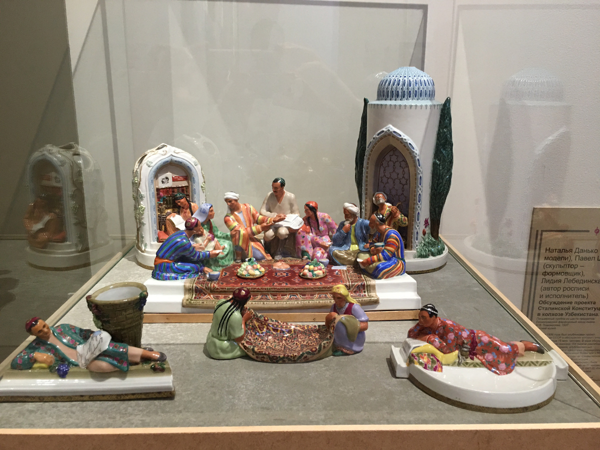 Называлась она "Обсуждение проекта Сталинской Конституции в узбекском колхозе". Я долго стояла, рот раскрыв, надо же как ярко и красочно можно обыграть политическую тему. Понятно что в узбекском колхозе, Восток, яркие краски, обсуждение той же конституции где-нибудь в деревне под Рязанью так не получилось бы сделать. На выставке в Эрмитаже тоже есть такая композиция, как я поняла, фарфор создают два человека: один делает скульптурную модель, другой ее расписывает. То есть одна и та же модель может быть расписана разными художниками, я этого не знала, не приходило в голову. Это модель Наталии Данько, она известный скульптор-керамист, погибла в 1942, вывезти успели, но по прибытии в эвакуацию умерла от последствий истощения.