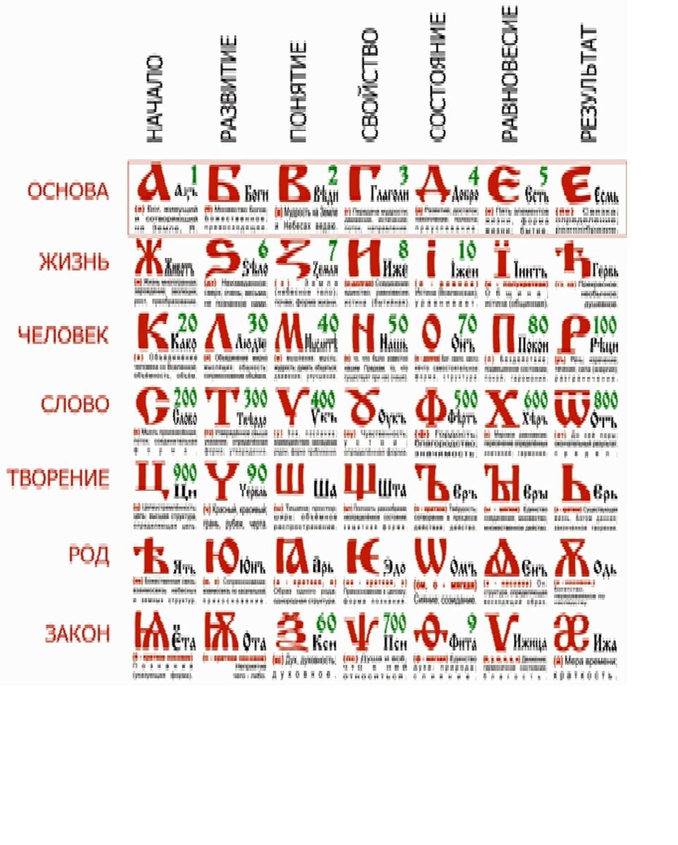 Мною не рассматривались расшифровки автора таблицы, данные им вокруг таблицы. Мною были рассмотрены только БУКВЫ(ЦИ) и их значение. К примеру: К-како Л-люди С-слово.