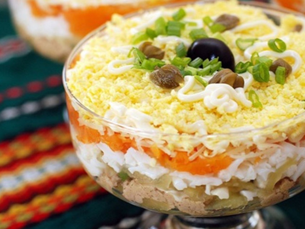 Привет, друзья! 🤗 Сегодня делюсь с вами рецептом салата на все случаи жизни — это слоёное произведение кулинарного искусства, которое украсит любой праздник и порадует ваших близких. Нежная печень трески в сочетании с овощами и ароматными специями создаёт неповторимый вкус, который запомнится надолго. Давайте готовить! 😉 Ингредиенты: - Печень трески — 1 банка (250 г) - Картофель — 2-3 шт. (среднего размера) - Морковь — 1-2 шт. (в зависимости от размера) - Яйца куриные — 3 шт. - Лук репчатый — 1 шт. - Огурцы свежие — 2 шт. - Майонез — 150 г (по вкусу) - Соль — по вкусу - Чёрный молотый перец — по вкусу - Зелень (укроп или петрушка) — для украшения Приготовление: 1) Картофель и морковь отварите в мундире до готовности, остудите, очистите и натрите на крупной тёрке или нарежьте кубиками. Яйца сварите вкрутую, остудите, очистите и нарежьте мелкими кубиками. Лук мелко нарежьте и обжарьте на сковороде до золотистого цвета. 2) На плоское блюдо начните выкладывать ингредиенты слоями: - П