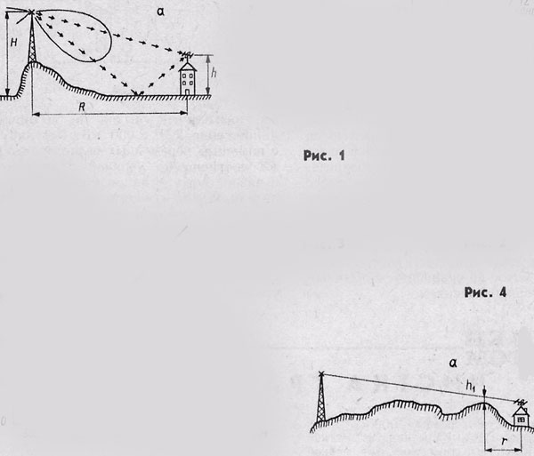 Во многих случаях неудовлетворительный прием телепередач объясняется неудачной установкой приемной антенны. Для того чтобы правильно установить телевизионную антенну, нужно хороню знать условия распространении радиоволн в месте приема. Рассмотрим сначала случай расположения антенны на ровной местности. Под ней не обязательно подразумевается степь или море. Если перед антенной находится даже сравнительно небольшая гладкая поверхность, например. поле или озеро, то это — тоже случай ровной местности. Так как радиоволны отражаются от такой поверхности, то к антенне приходят две волны: одна — непосредственно, а другая — после отражения (рис. 1,а)... Известно, что волны, отраженные от посторонних предметов, вызывают на экране телевизора повторные изображения. Однако волны, отраженные от земной поверхности, не могут быть причиной повторов, так как время распространения таких отраженных волн мало отличается от времени распространения прямых волн. Поэтому для достижения наилучшего качества изо