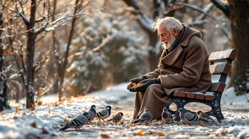 Я вышел на балкон покурить — обычная пятиминутка перед сном. Стоял мороз, и дыхание превращалось в маленькие облачка пара, которые тут же растворялись в воздухе. Внизу, у подъезда, кто-то возился с мусорным контейнером. Я прищурился: старик в длинном сером пальто копался в отбросах. Он что-то достал, осмотрел и бережно положил в пакет. "Чудной какой-то", — подумал я и вернулся в квартиру. На следующий день я снова увидел его. На этот раз он сидел на скамейке во дворе, рассыпая что-то по земле. Птицы слетались к нему со всех сторон — голуби, вороны, даже пара синиц. Я заинтересовался и подошёл ближе. — Привет, — сказал я, чтобы как-то начать разговор. Он обернулся, и я заметил его глаза. Они были необычными — глубокими, словно хранящими целую жизнь воспоминаний. — Привет, — ответил он спокойно, будто ждал, что я подойду. — Что это вы тут делаете? — спросил я, хотя уже догадывался. — Кормлю птиц. Зимой им трудно. Особенно когда люди забывают о них. Я кивнул, но что-то в его голосе застав