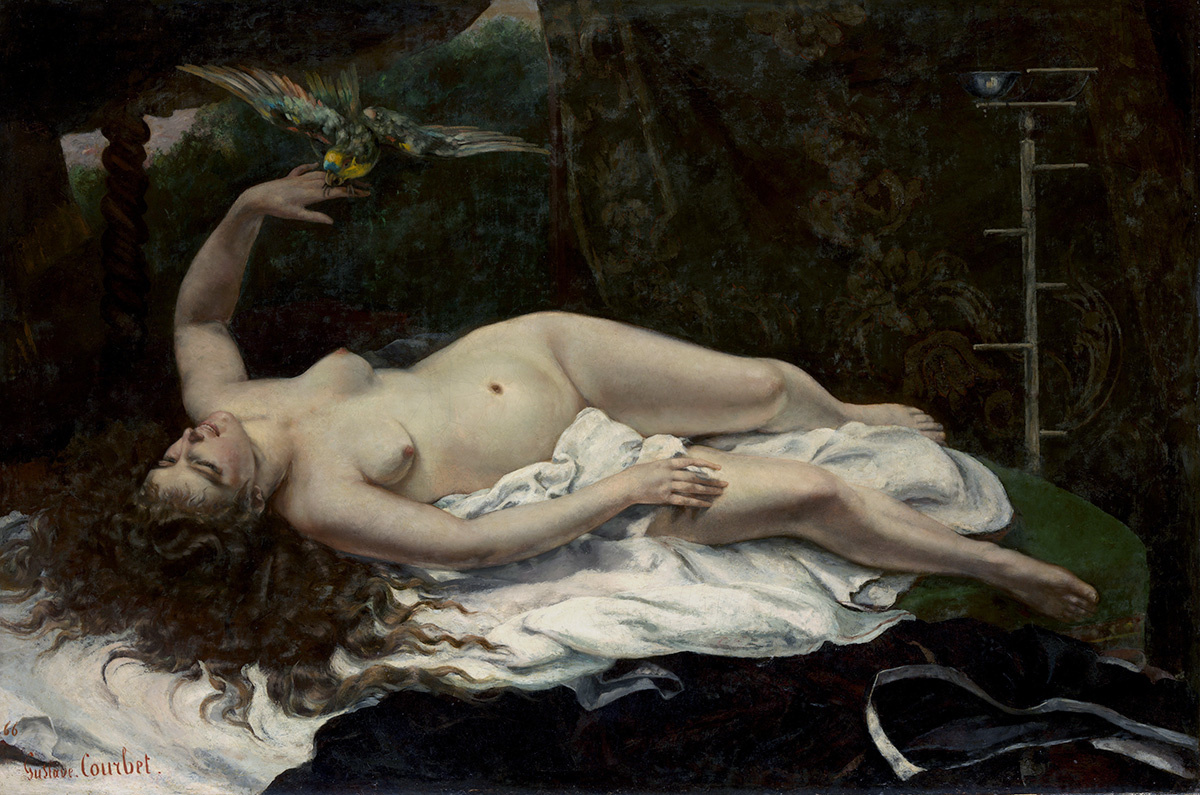 В январе 1866 года Гюстав Курбе (1819-1877) написал своему другу Альфреду Брюйасу, что в течение полутора месяцев он должен завершить две картины для предстоящего Салона: «Remise de Chevreuils» и «Une Femme Nue». Последняя, несомненно, является отсылкой к этой картине. Двумя годами ранее он написал картину под названием «Пробуждение» или «Венера и Психея», на которой изображены две обнаженные фигуры: одна сидящая, а другая лежащая на кровати. Рассматриваемая картина создана во многом на основе лежащей фигуры из «Пробуждения» — художник сохранил тот же балдахин и одну из витых колонн. Существуют три картины Курбе, изображающие лежащую женщину, которые были названы этюдами к этой картине, но позы женщин с руками по бокам всё ещё напоминают спящую фигуру из «Пробуждения», и ем одна из них не демонстрирует игривую, бодрствующую позу «Женщины с попугаем». Тщательная проработка данной картины, с её продуманной позой и проработанным фоном, вызвала парадоксальную реакцию критиков. Художни