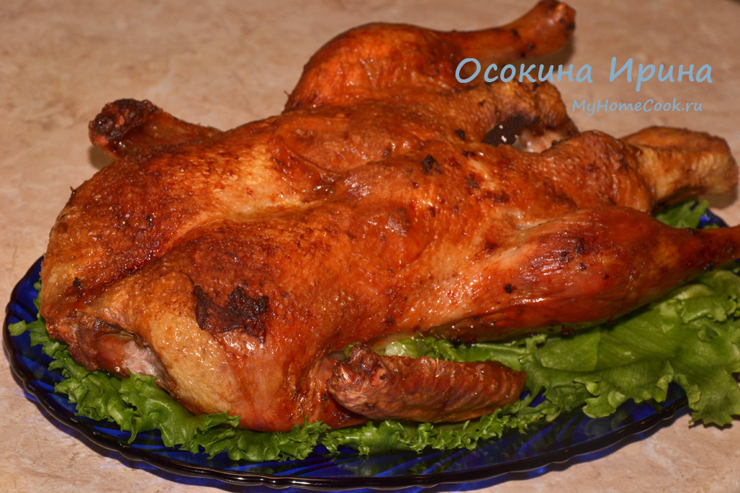 Решила запечь уточку целиком и при этом не мучить её маринадами. Вчера в ёмкость влила 4 л воды, добавила 2 ст.л. соли и 1 с.л. яблочного уксуса и промешала. Тушку утки разморозила, промыла, погрузила в подготовленную ёмкость с водой и оставила на ночь. Сегодня достала утку, обсушила, натёрла перечной аджикой, уложила в форму грудкой вниз и запекла в духовке, разогретой до 180 градусов, в течение 45 минут, достала форму, перевернула утку и вернула в духовку ещё на 45 минут, достала форму, дала утке "отдохнуть" под фольгой и подала. Вкуснейшая, сочнейшая птичка с безумно вкусной хрустящей кожицей) Приятного аппетита
