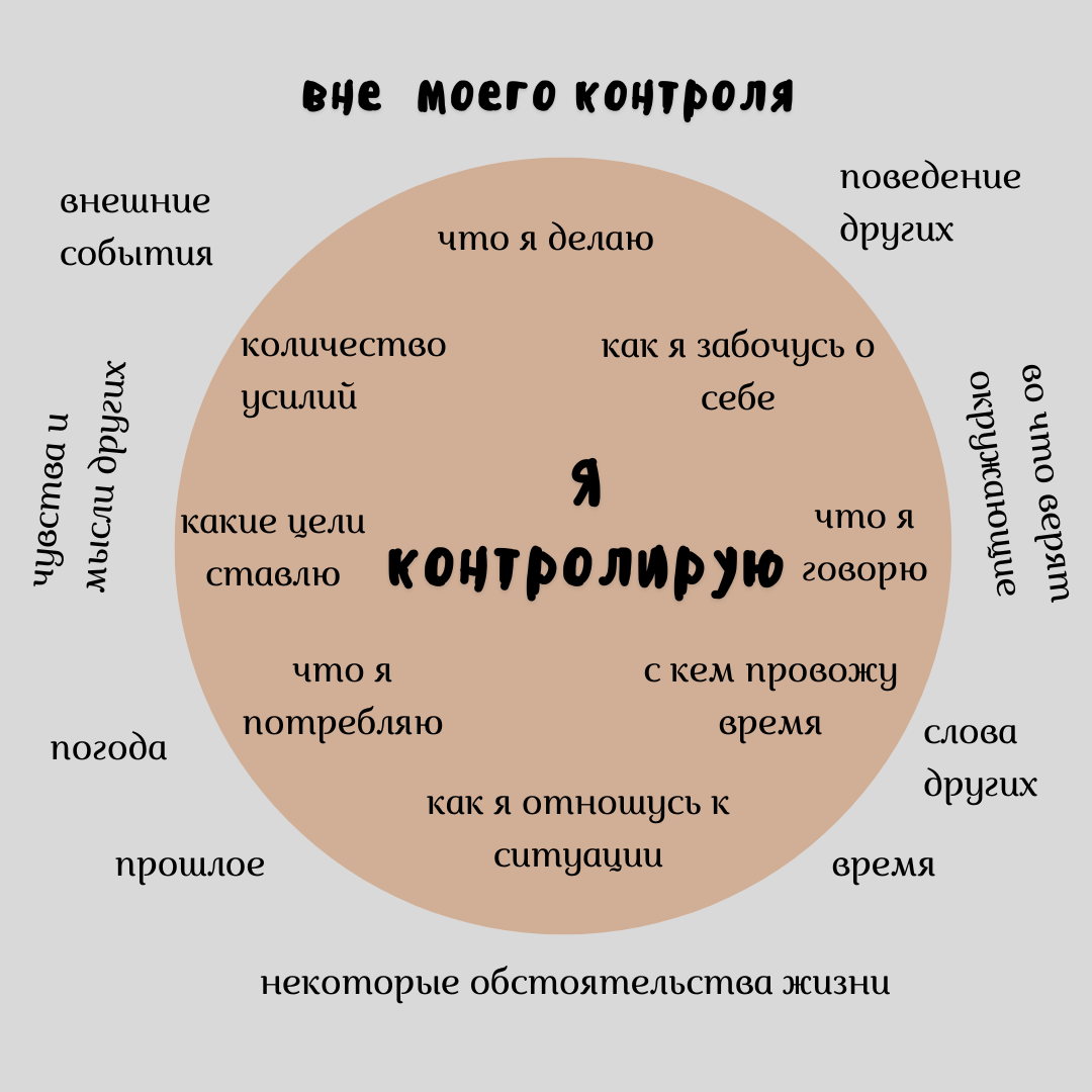 В последнее время наблюдаю много тревоги – у себя, своих коллег, клиентов, знакомых. Это совсем неудивительно в связи с растущей неопределенностью в мире. То, что помогает лично мне – спрашивать себя "А на что я могу повлиять?" В таком подходе для начала важно определить и принять то, что находится вне зоны нашего контроля. Пример: Далее сместим фокус на то, что находится в нашей власти. Пример: Так, мы не можем изменить плохую погоду, но можем, например, теплее одеваться, чтобы не заболеть. Мы не можем отменить негативные события в мире, но можем решить, какую информацию потреблять ежедневно и какие способы выбирать, чтобы позаботиться о себе. Понимая это, мы освобождаем энергию, которая обычно уходит на тревогу о неподвластном. А затем направляем ее на действия, которые от нас зависят. Для наглядности хочу привести историю Виктора Франкла – австрийского психиатра, психолога и бывшего узника концлагеря. В своей вдохновляющей книге «Сказать Жизни “Да!”», он описывает, как даже в самых