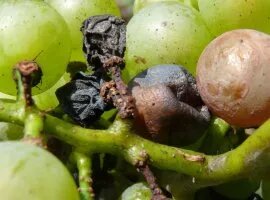 Грибковое заболевание винограда. Само виноградное растение не сильно страдает от заселения грибницей. А вот гибель ягод может достигать 80 - 100%. Но даже если в каждой грозди будет всего 10% загнивших плодов, то урожай будет невозможно продать, или изготовить из него хорошее вино или сок. После цветения, в течение 3 - 5 недель, ягоды обладают устойчивостью против спор этого грибка. Болезнь возникает на ягодах достигших 2/3 от обычного размера. Сначала появляется белая точка - это центр развития грибка, затем вокруг неё стремительно образуется светло-коричневое кольцо. За 10 дней вместо долгожданной ягоды образуется сухая, твёрдая мумия, начинённая спорами грибка Чёрной гнили. Зимуют споры в мумифицированных плодах, на земле. Прорастание грибницы начинается одновременно с выходом побегов. Оптимальная температура + 27 С, в такой период для проникновения споры в плод и заражения нужно всего 6 часов. А при температуре + 15 С, всего 24 часа. На мой взгляд, основная неприятность этой групп