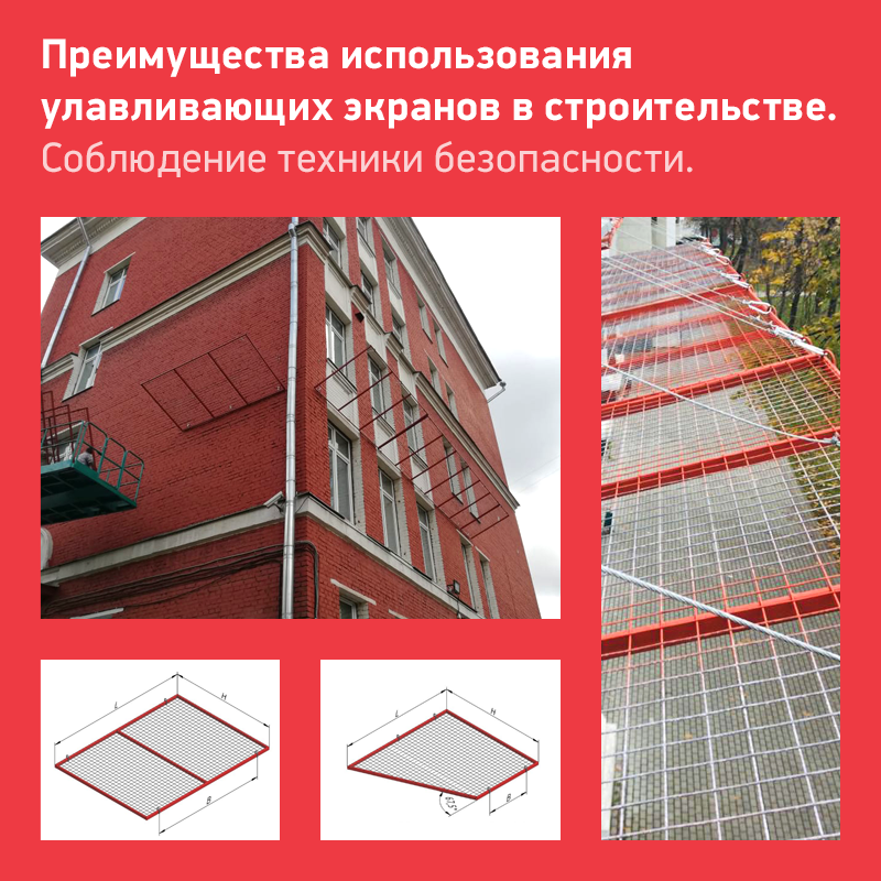 Защитные экраны улавливают падающие предметы, обеспечивая безопасность рабочих на строительной площадке. С наступлением холодов и увеличением осадков возникает проблема падения льда и снега с крыш зданий на прохожих. Проблема вызвана перепадами температуры, приводящей к образованию сосулек и наледи. В зимний период строительные работы продолжаются, поэтому увеличивается риск падения строительного мусора и предметов. Защитный экран для фасадов зданий состоит из стальной рамы и металлической сетки. Конструкция крепится к стене. Задача улавливающего сооружения — предотвратить падение предметов на работающих или проходящих мимо людей. Рабочая часть экрана выполнена из сварной металлической сетки с размером ячейки 50 на 50 миллиметров. Полотно обеспечивает прочность, надежно защищает от получения травм людей и животных. Улавливающие экраны крепятся на фасад готовых зданий с помощью специального крепежа. В комплект входят: Защитное сооружение занимает один этаж, поэтому надежно закрывает ниж