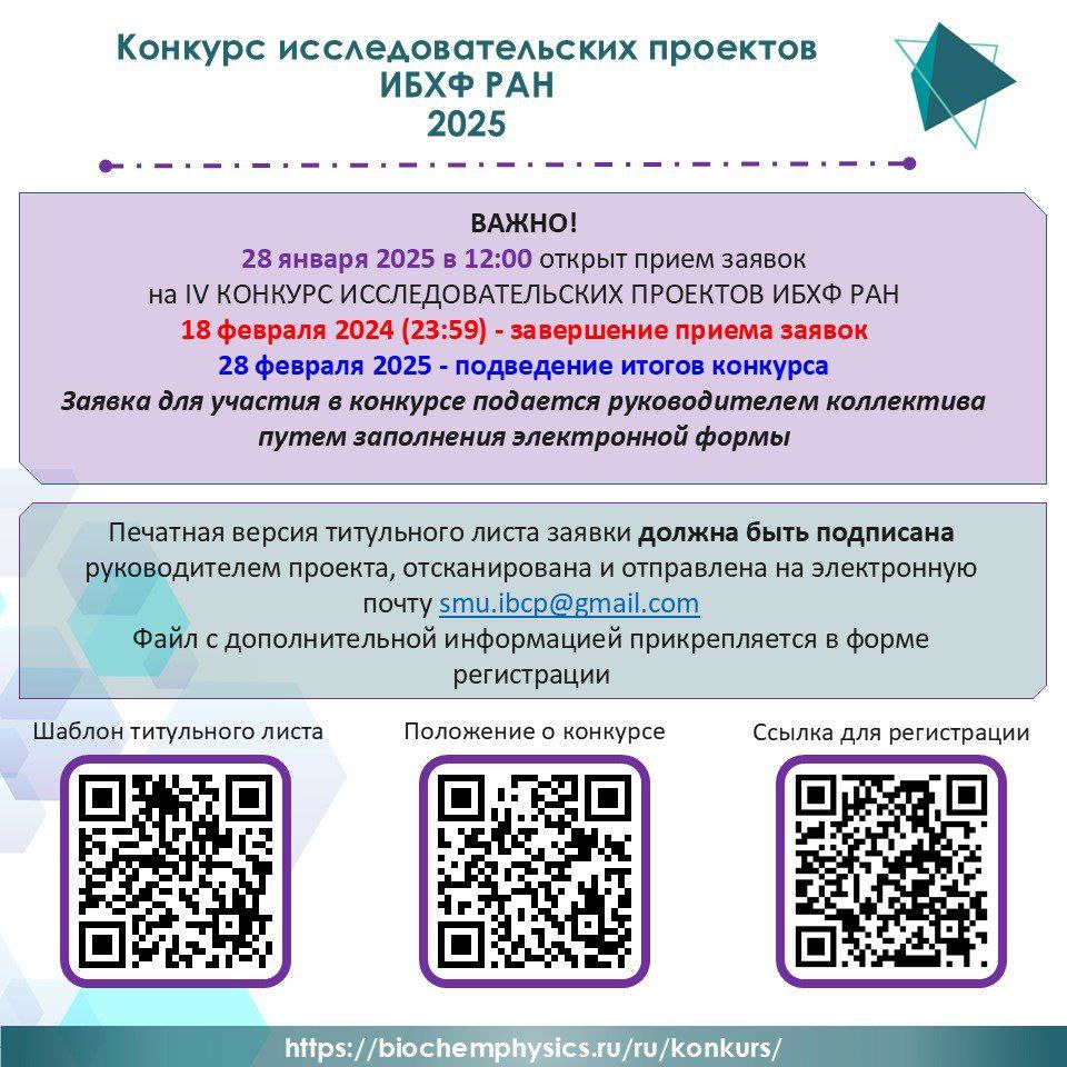 Уважаемые сотрудники ИБХФ РАН! Открыт прием заявок на IV КОНКУРС ИССЛЕДОВАТЕЛЬСКИХ ПРОЕКТОВ ИБХФ РАН Ключевые даты: 16 февраля 2025 (23:59) - завершение приема заявок 28 февраля 2025 - подведение итогов Заявка для участия в конкурсе подается руководителем коллектива путем заполнения электронной формы. Печатная версия титульного листа заявки должна быть подписана руководителем проекта, отсканирована и отправлена на smu.ibcp@gmail.com Файл с дополнительной информацией прикрепляется в форме регистрации. Шаблон титульного листа
