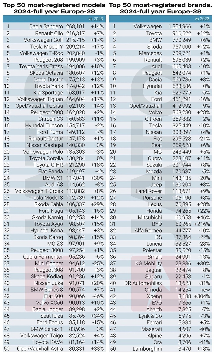 Авторынок Европы 2024: Dacia Sandero на первом месте, резко вырос спрос на гибриды