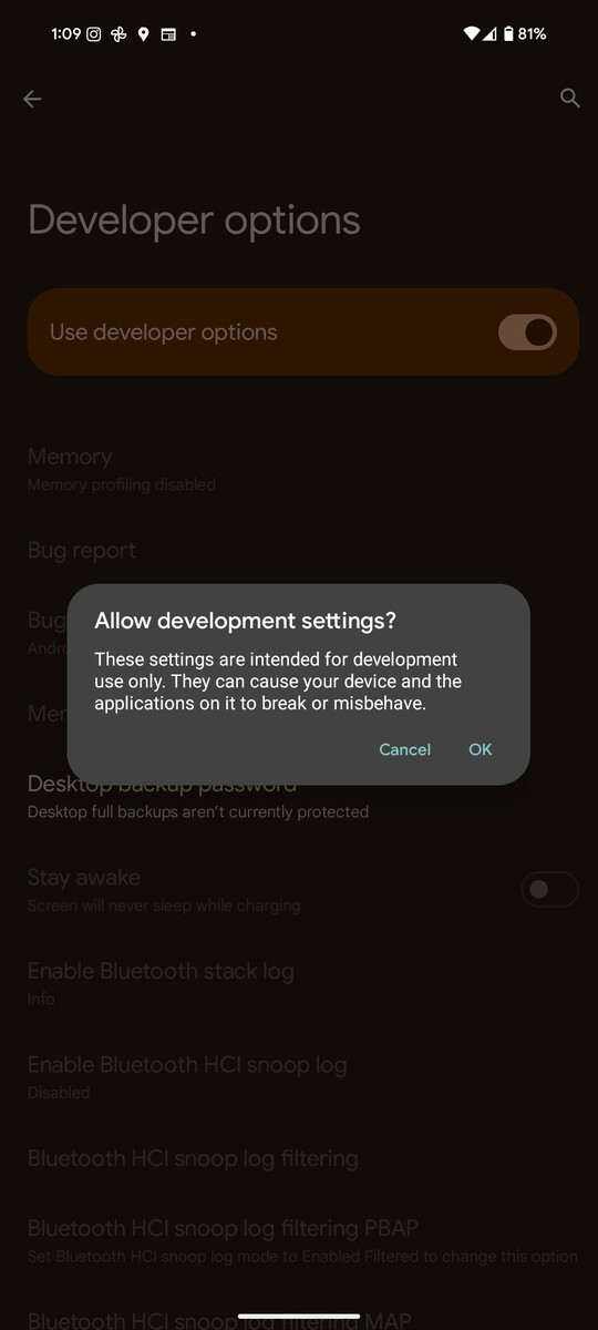 При первом доступе к меню вам нужно будет вручную активировать переключатель Использовать опции разработчика и подтвердить действие в появившемся диалоговом окне.