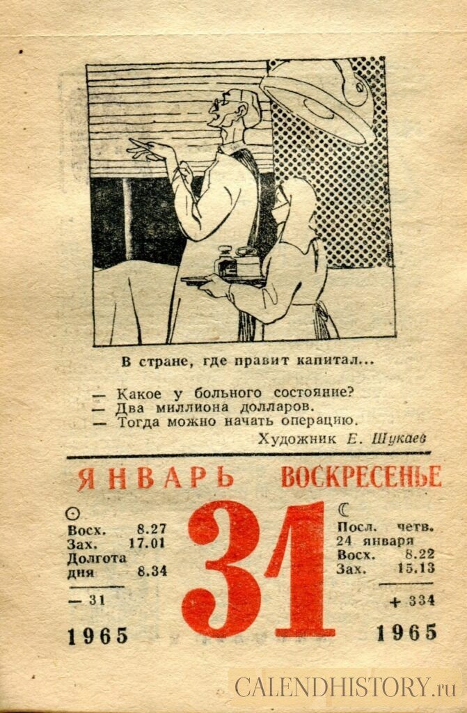 Итак, сегодня 31-го января и у нас на календаре 1965-й год. Перед нами листок советского календаря для женщин. На календаре у нас воскресенье - 31 января 1965-го года. В стране, где правит капитал… — Какое у больного состояние?