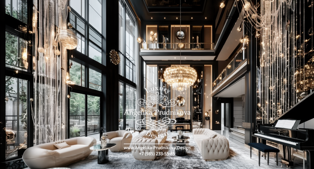 Черный и золото — идеальный тандем для роскошной гостиной в стиле арт-деко с панорамными окнами и вторым светом. Такое цветовое решение возглавляет список актуальных интерьерных трендов, и позволяет создать нетривиальный люксовый дизайн в лучших традициях эпохи «Великого Гэтсби».
