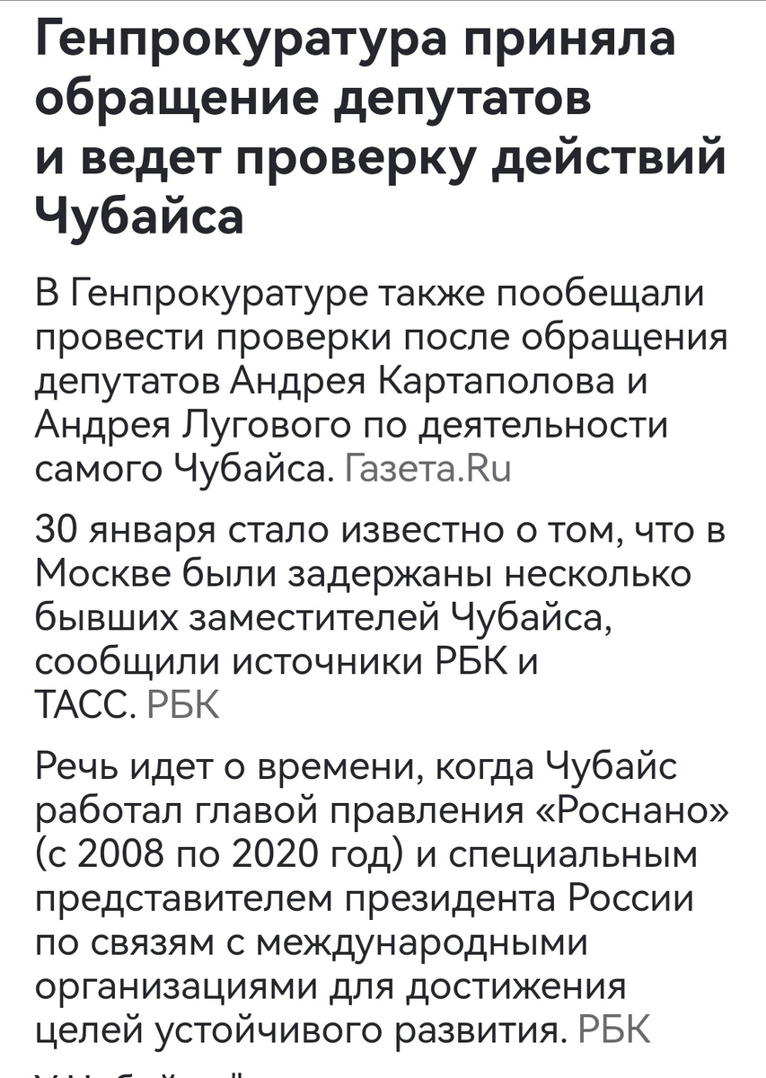 Удивительные дела происходят, начинаю чувствовать себя шаманкой))) иногда стоит о чём-нибудь подумать или пожелать, как жернова истории начинают крутиться))) Особенно, когда напишу здесь, на Дзене😀 Вот почти две недели назад я психанула и ни с того, ни с сего написала эту статью На самом деле, причина какая-то была, видимо, настолько несуразная, что вот вспомнила неприкосновенного Толю Васечкина... А через сутки стали происходить поразительные вещи в его окружении, бывшем, конечно. А вчера вот читаю продолжение: И чувствую, что у меня прям нимб растет🙈. Сижу и думаю - чего ещё пожелать? Главное теперь, чтоб не останавливались на начатом и додавливали до конца. Источники Telegram-канала (Мash) утверждают, что по делу проходит и сам Чубайс, три года назад покинувший Россию. Не, у меня есть, конечно желание - однажды прочитать, что всех, кто был недостаточно лоялен к нашей власти, вернее совсем не лоялен из работников платформы, тоже привлекут по полной, вплоть до уголовной ответств