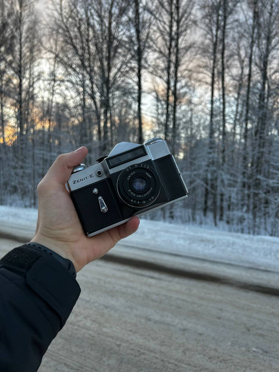 Недавно у меня появилась мысль попробовать поснимать на плёночный фотоаппарат, но тратить большие деньги на, возможно, одноразовое занятие не хотелось. Я отправился на площадку с объявлениями, и после недолгого поиска нашёл подходящий вариант — советский Зенит-Е с объективом Индустар-50-2 и чехлом всего за 1400 рублей. Продавец сказал, что фотоаппарат исправен, и я тут же сделал заказ. Следом купил плёнку Kodak Ultramax 400 на 36 кадров за 1500 рублей. Через несколько дней, получив фотоаппарат и почитав в интернете, как им пользоваться, я вставил плёнку и пошёл делать первые снимки. Сам фотоаппарат — это один большой и тяжёлый кусок металла. Он выглядит намного дороже, чем деньги, за которые я его купил. Можно просто поставить на полку, чтобы радовал глаз. В целом, фотографировать я не умею, немного изучил базовые термины и сразу начал снимать. После проявки больше половины фотографий были либо засвечены, либо на них ничего не было видно, но получилась одна забавная тёмная фотография с