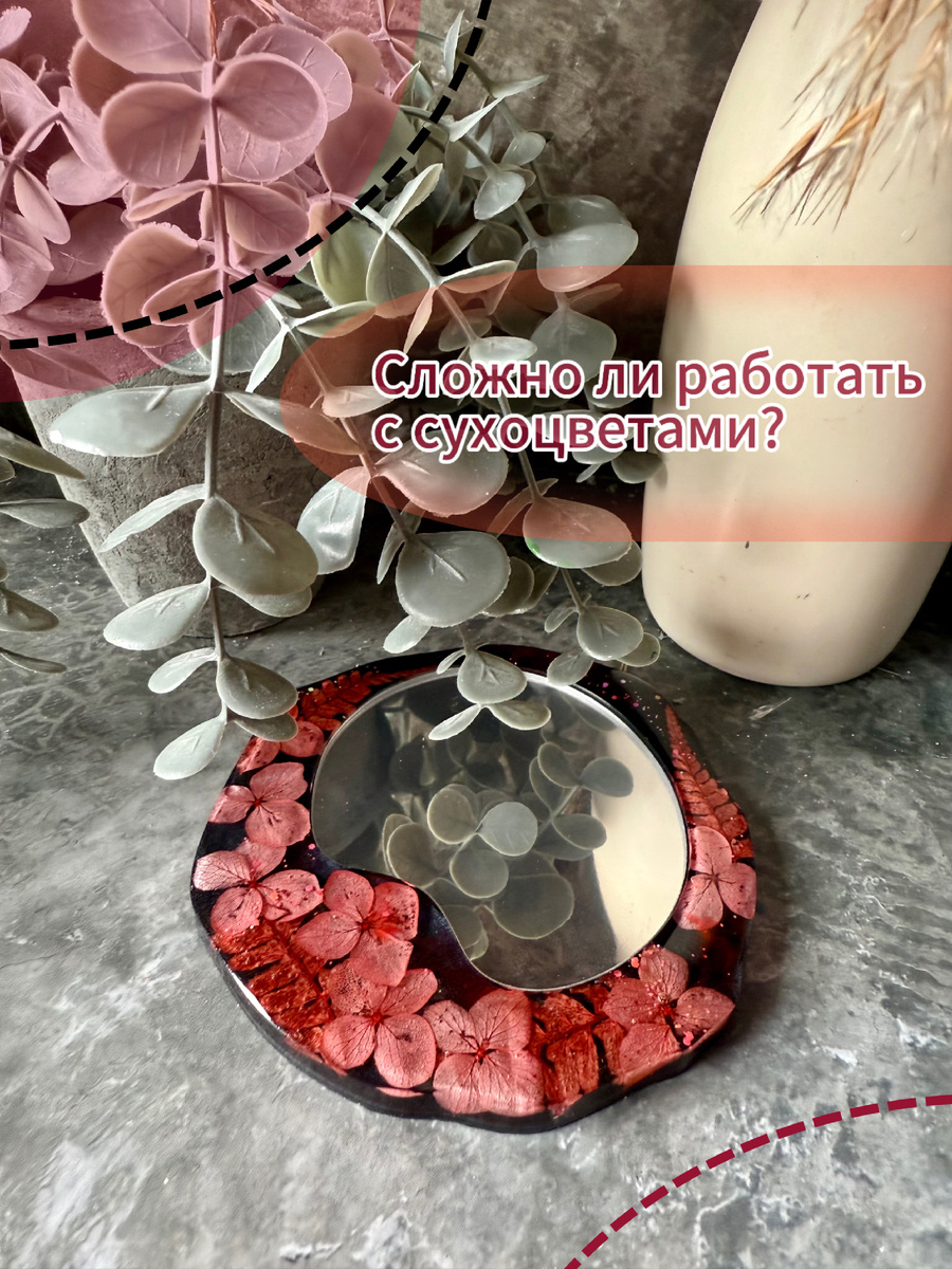 ✨Исходя из моего НЕБОЛЬШОГО опыта, если быть точнее, зеркала — это первые мои заливки сухих растений в смолу, могу с уверенностью заявить, что сложности здесь, ОПРЕДЕЛЕННО, есть 🫣 🔹Во-первых, все цветочки должны быть прям СУХИЕ! полусухие не подойдут, через 2-3 недели они начнут гнить, одно зеркало я так уже запорола (как-нибудь покажу) 🥹 там цветочки были слегка не досушены, прям чуточку, но это «слегка» сильно повлияло на исход в дальнейшем 😔 🔹Во-вторых, чтобы избежать появление даже малейших пузырей, хоть меня они и не смущают, нужно цветочки сперва обмокнуть в смоле, а потом только заталкивать в молд 👌 🔹В-третьих, работа с композицией 🫣 всегда была уверена, что уложить сухоцветы — дело пары секунд, чего там, положил, да и красиво 😍 но нет.. цветочки выкладываются вверх тормашками, то есть, лицевая сторона там, где результата ты не видишь сразу 🤪 И до каких-то супер крутых композиций я ещё не доросла: 2-3 разновидности цветочков максимум, больше — пока что боюсь) ——————