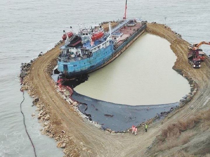 Вот только сейчас стало видно, что начались какие-то реальные настоящие движения по сбору мазута. Только недавно я увидел, что за дело взялись специалисты. Вот на фото, например, уже видно, что дело стало походить на правду по устранению последствий. Судно не просто обставили боновыми заграждениями, но даже осыпали грунтом, что само собой получше чем просто боны. Идеально там уже ничего не сделать, но все равно, так уже лучше.
