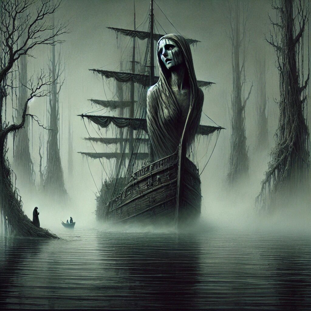 Небольшой корабль медленно рассекал густой туман. Сквозь пелену виднелась фигура женщины, искусно вырезанной из дерева. Ее обнаженное тело, украшающее нос судна, было безобразно. Ребра, впивающиеся в деревянную оболочку, были разведены невидимыми легкими, словно набирая воздух перед криком. Не менее исхудавшее лицо исказилось отчаянием. Редкие брови сдвинуты к середине лба, глаза обращают молящий взгляд к небу. Мастер, создавший эту скульптуру, старался запечатлеть в женщине все — даже сухие губы, давно не вкушавшие еды. Она точно застыла в безмолвии, затерявшимся в тумане. Взгляд двоих людей на корабле замылился бесконечными молчаливыми пейзажами. Деревья с опущенной темно-зеленой листвой повсеместно хранили зачаровывающую печаль.