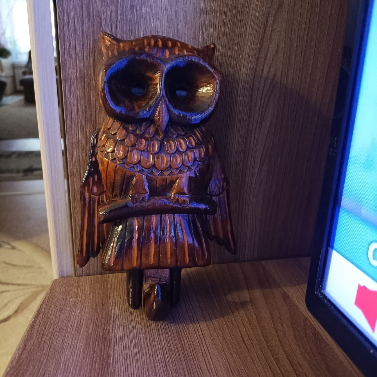 Одна знакомая вчера принесла мужу вот такую сову, надо её починить. Смотрите какая милая вещица! Муж, конечно, починил. Когда на нее что-то вешаешь, она открывает глаза и поднимает крылья. Я подозреваю, что и не ключница это вовсе, а просто вешалка. Потому, что веса ключей недостаточно, чтобы сова проснулась. У нас в коридоре тоже есть совушки для ключей. Забавные штучки. Они магнитные, подносишь ключи, они примагничиваются и совы открывают глаза. Но деревянная, конечно, внушительнее, она такая, весомая. Мне вообще очень нравятся изделия из дерева. Даже не знала, что раньше в продаже были такие вешалки. А вы любите ключницы?