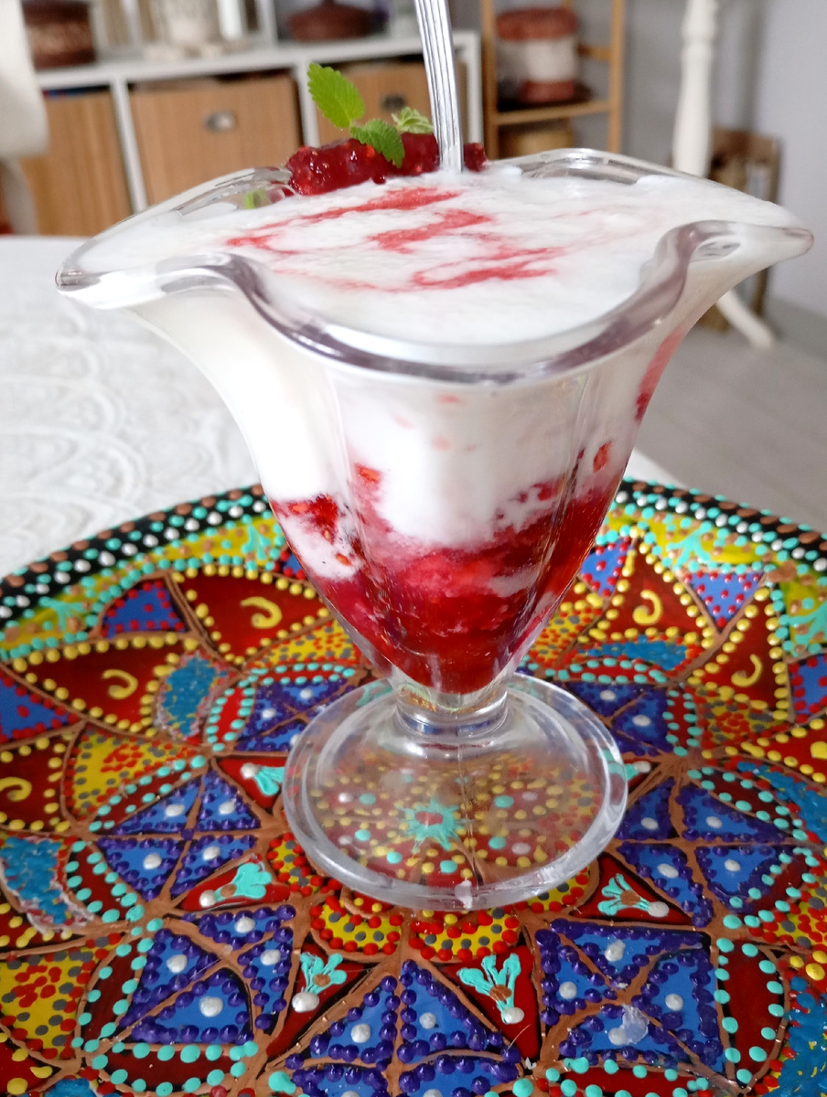 Еда домашняя, кулинария дома Продолжаю писать рецепты за 29 января из тоо, что приготовила. Когда всё готово, нужно же и десерт какой-то приготовить и название придумать.И вот придумала. Ну чтобы, что-то приготовить, надо посмотреть, а что есть у меня для десерта. У меня есть кефир, молока почти нет, вот из кефира и приготовлю лёгкий десерт. У меня как никогда кефира в холодильнике аж 1,5 литра. Мне понадобилось: Честно, когда я что-то хочу быстро сделать, да и вообще в граммах не измеряю. Так что взяла по столовой ложке малины и немного клубники, засыпала сахаром. . Когда ягоды растаяли, дали сок, сварила быстрое варенье. Варила пятиминутку, при постоянном помешивании, снимала пену. Дала варенью из малины и клубники остыть. А аромат какой,, сразу летний малиново-клубничный разнёсся по дому. Кефир взбила блендером и он стал воздушный как снег. А теперь соединила зиму и лето. На дно кремагки налила варенье, затем аккуратно взбитый кефир Сверху струйкой налила ещё немного сиропа