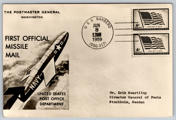 Наиболее масштабные эксперименты с ракетной почтой проводились в Соединенных Штатах Америки. Американские инженеры стремились создать максимально надежную и точную систему доставки. Кульминацией этих усилий стал эксперимент, проведенный 8 июня 1959 года. В тот день Почтовая служба США совместно с Министерством обороны запустила крылатую ракету SSM-N-8 Regulus, способную преодолевать расстояния до тысячи километров. Ракету запустили с подводной лодки USS Barbaro, которая находилась недалеко от берегов Вирджинии, близ города Норфолк. Полет прошел успешно – всего через двадцать две минуты три тысячи писем были доставлены на военно-морскую базу в Мейпорте, штат Флорида.