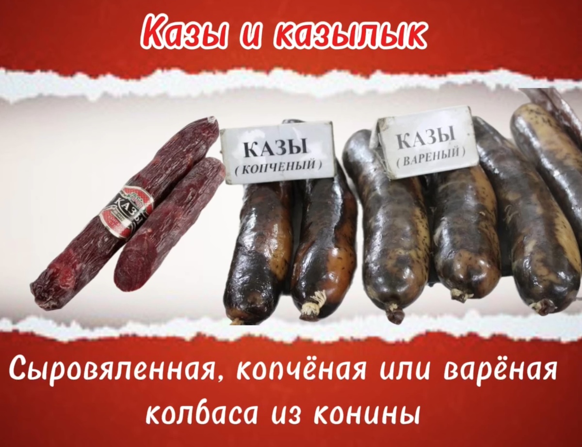 Казылык — это сыровяленая колбаса из свежей конины, в меру твёрдая, с характерным сладковато-солёным вкусом.
