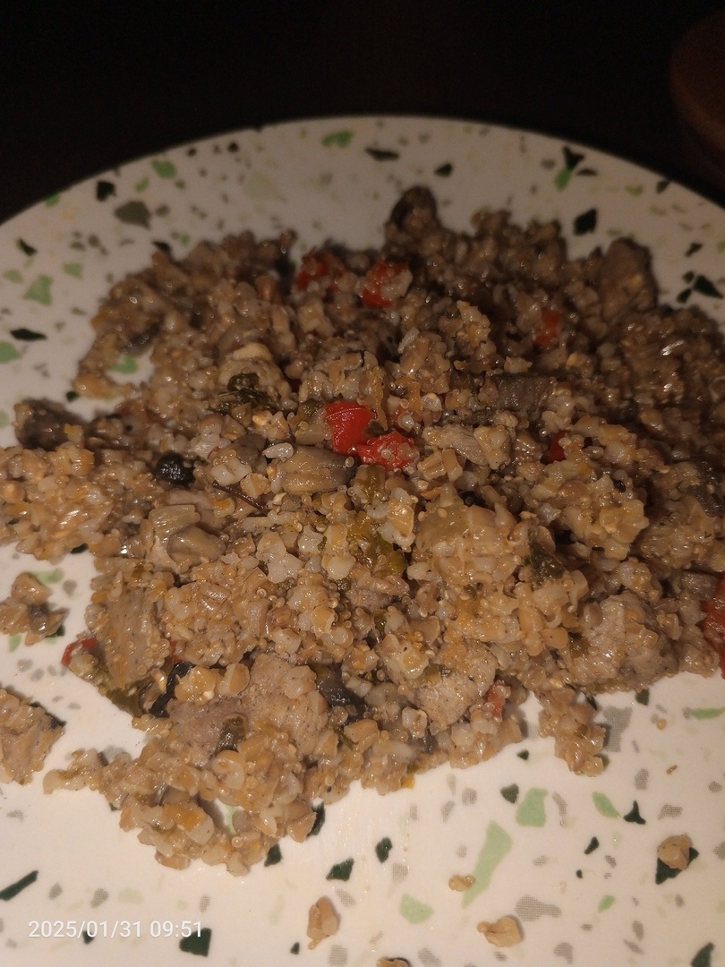 Я уже более недели соблюдаю свою личную диету. Не слушаю диетологов, консультантов по питанию, а просто придерживаюсь своих менее тяжелых блюд. Вчера я приготовила полбу с амарантом и овощами немного добавив свинину. Готовлю каждый вечер себе на ужин индивидуальное блюдо, а также беру с собой на работу на обед. 2. К овощам добавляем свинину. Я покупала специальную поджарку из свинины. Мне достаточно было грамм 30 на данное блюдо. Свинину обжариваем до полуготовности. 3. Добавляем специи, лавровый лист и смесь сушенных трав (петрушка, укроп, сельдерей, лук) 4. К свинине добавить смесь круп - полбу и амарант. Я предварительно промываю смесь, вытащив ее из пакетика 5. Тщательно перемешать и залить наше блюдо водой. Вскипятить и тушить н медленном огне 20 мин, либо до испарения воды. 6. Блюдо получается ароматным и просто вкусным !