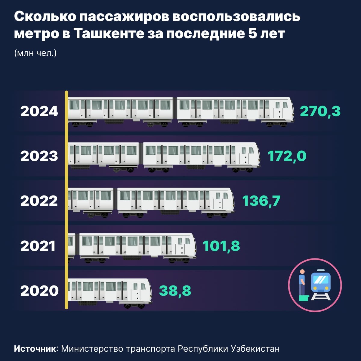 В 2024 году метро Ташкента перевезло почти на 100 млн человек больше чем годом ранее