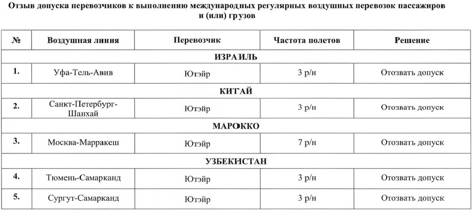 Utair лишился допуска к выполнению нескольких международных авиарейсов. Решение об отзыве приняла Росавиация в конце января 2025 г. Согласно опубликованному документу, тюменский авиаперевозчик не сможет летать в Самарканд из Тюмени и Сургута, в Тель-Авив из Уфы, в Шанхай их Санкт-Петербурга и в Марракеш из Москвы. Почему было принято такое решение, в ведомстве не пояснили. В пресс-службе Utair DK.RU сообщили, что неиспользуемые допуски были отозваны по собственным заявлениям авиакомпании. Допуски по маршрутам Тюмень/Сургут — Самарканд были выданы в рамках режима открытого неба в Самарканде и автоматически продлялись Росавиацией, несмотря на наличие постоянных допусков, полученных авиакомпанией позднее на конкурсной основе. Таким образом, для исключения «задвоения», допуски, выданные в рамках открытого неба, были отозваны, — уточнили в компании. Сам по себе допуск Росавиации не означает, что компания может выполнять международный рейс. Полеты стартуют только после того, как будут выполн